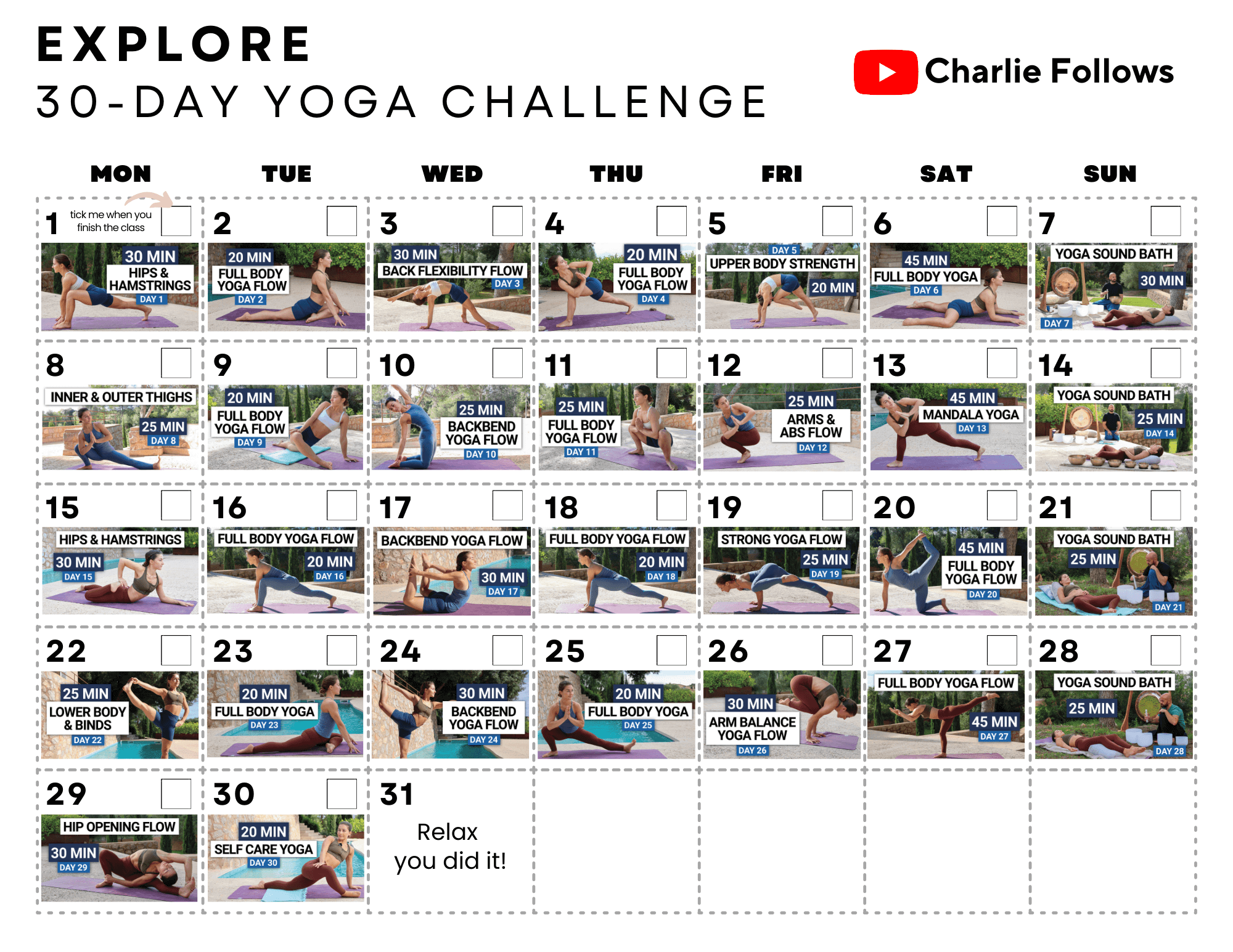 Within the challenge we will practice more challenging postures you may not have done before like side splits, crow pose, wheel, sugarcane, dancer, compass and many many more.